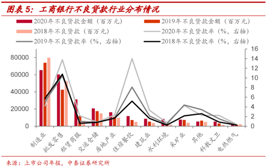 不良贷款的行业分布方面,不良贷款率排前三位的行业为居民服务和其他服务业(7.62%)、房地产业(6.33%)、制造业(4.27%)。具体来看,房地产业2020年末不良贷款率较上年末增加4.87个百分点,制造业较上年末上升2.27个百分点,批发和零售业较上年末下降1.14个百分点。