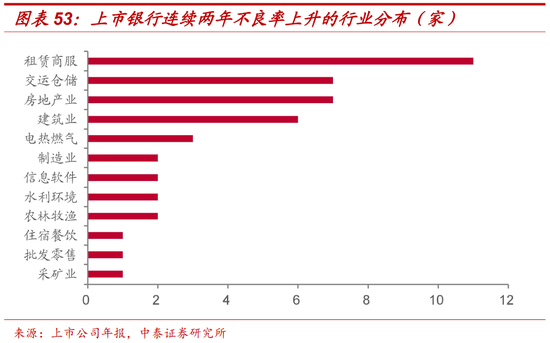 根据分行业披露不良贷款率的25家银行的可比数据,有11家上市银行的租赁和商务服务业贷款不良率连续两年上升。交通运输、仓储和邮政业和房地产业均有7家,建筑业有6家,电力、热力、燃气及水生产和供应业有3家。