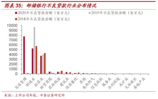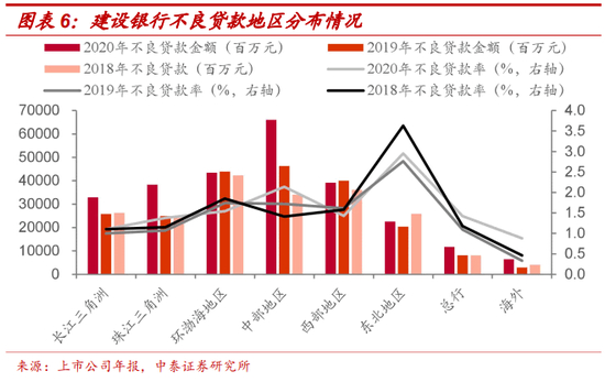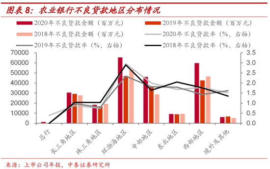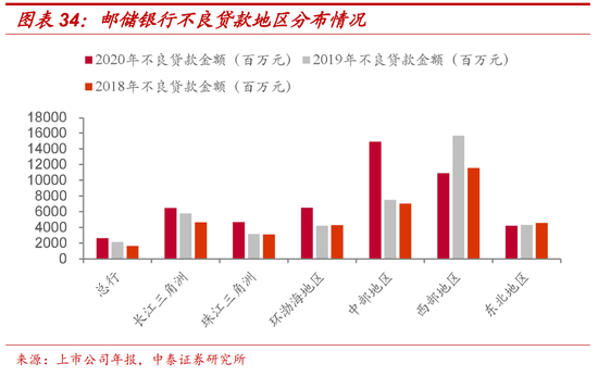 从不良贷款的地区分布看,2020年末不良贷款中,环渤海地区占比27.6%,西部地区占比25.2%,中部地区占比19.4%。不良贷款余额变动方面,总行不良贷款余额从2019年的0.06亿增加到13.69亿,上升22716.67%,西部地区从2019年的425.37亿增加到597.90亿,上升40.56%,环渤海地区从2019年468.83亿增加到654.05亿,上升39.51%,中部地区从2019年359.69亿增加到460.09亿,上升27.91%。