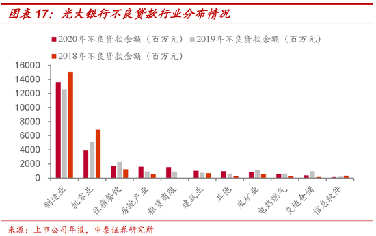 不良贷款的行业分布方面,不良贷款余额前三位的行业为制造业、批发和零售业、住宿和餐饮业,分别占比32.66%、9.35%、4.14%。其中,制造业不良贷款余额从126.05亿增加到136.08亿,上升7.96%;批发和零售业不良贷款余额从51.41亿降至38.97亿,下降24.2%;住宿和餐饮业不良贷款余额从22.8亿降至17.24亿,下降24.39%。