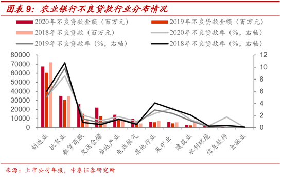 不良贷款的行业分布方面,不良贷款率排前三位的行业为采矿业(7.26%)、批发和零售业(4.85%)、农、林、牧、渔业(4.7%)。其中,采矿业2020年不良贷款率较上年末上升0.91个百分点,批发和零售业较上年末下降2.57个百分点,农、林、牧、渔业较上年末下降11.55个百分点。