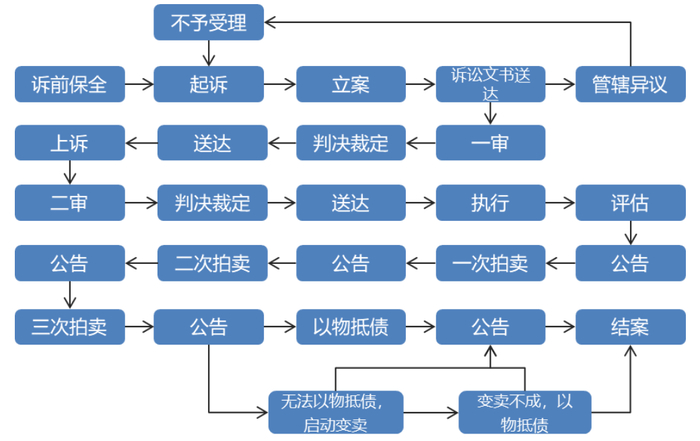 结合金融机构抵质押物处置实践经验,抵质押物的主要处置方式为诉讼拍卖,因此抵质押物处置回收时间主要取决于法律诉讼进度。一般情况下,法律诉讼程序包括申请诉讼、送达、调解、保全、审判、执行等程序,全部程序耗时约在1~3年左右。