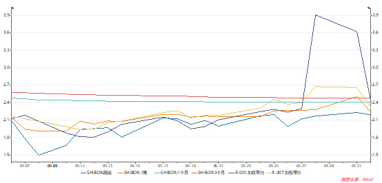 今日隔夜Shibor2.1870%,较昨日下行4.00BP;一周Shibor2.2330%,较昨日下行26.90BP;一个月Shibor2.4060%,较昨日下行0.10BP;三个月Shibor2.4780%,较昨日下行0.10BP; 隔夜回购加权平均利率2.4145%较昨日下行120.30BP;7天回购加权平均利率2.3103%,较昨日下行34.49BP