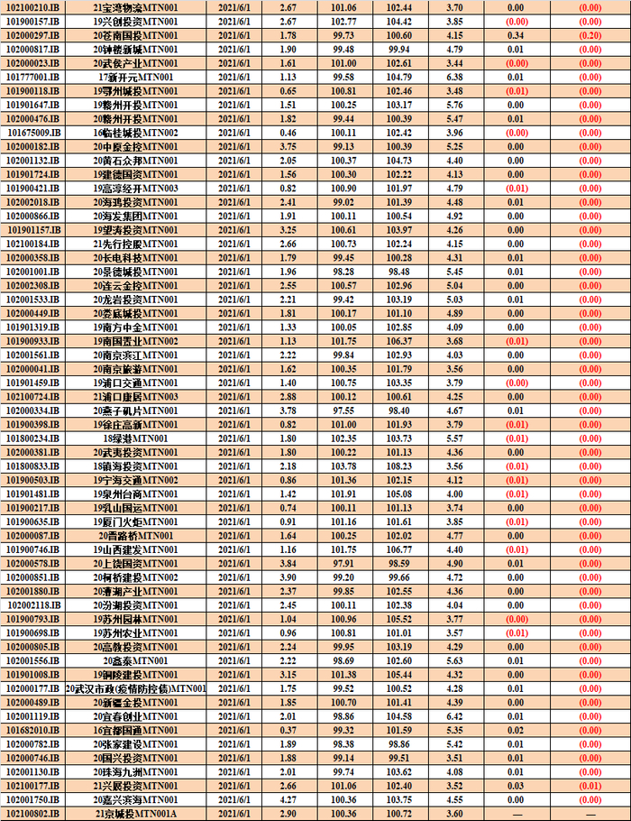20210601城投债到期收益率曲线关键期限点值相较昨日变动