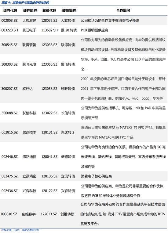 消费电子和通信设备是华为重要业务,设计产业链较多,合作公司数量也较多,结合公司经营情况和可转债弹性我们建议重点关注聚飞转债、欣旺转债。