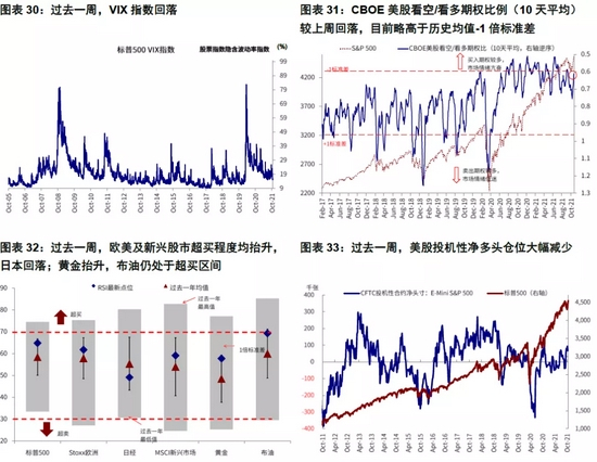 过去一周,欧美及新兴股市超买程度均抬升,日本回落;黄金抬升,原油继续超买;此外,美元多头继续增加,铜多头激增;10年美债净多头大幅减少,2年美债净空头仓位明显增加。