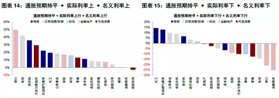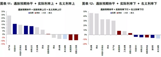 此外,我们还发现通胀预期有较长时间的持平阶段,很难完全归到上述上行或者下行几类当中,不过其表现与实际利率和名义利率同样走势下的资产和行业表现并不显著差异,因此可以近似看作是同样趋势下的延续和过渡阶段,这里不再赘述。