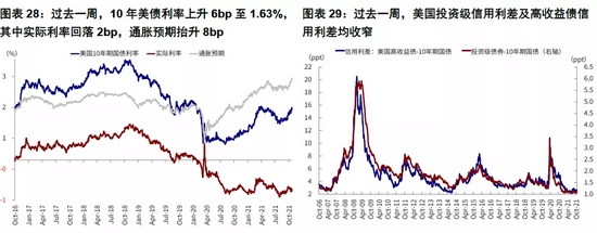 过去一周,美股三季度业绩期密集披露,业绩持续向好,当前标普500指数23%的公司已披露业绩,超预期幅度达96%,业绩总体好于预期缓解了市场对增长的担忧,进而推动市场整体上行。不过随着油价继续上行,通胀预期再度抬升并超过前期高点,推动10年美债利率一度冲高1.7%。整体来看,美元计价下,股>债>大宗;港股及美国中概领涨,巴西股市、铜、天然气、比特币领跌。利率方面,过去一周,10年美债利率抬升6bp至1.63%,其中实际利率回落2bp,通胀预期抬升8bp。风格方面,汽车与金融地产跑赢,周期及成长相对跑输。