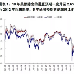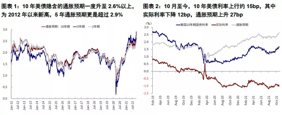 全球资产近期出现一些分歧甚至“打架”的现象,也反映了市场预期的相对混乱。一方面,9月底10月初国际能源价格上涨和供应链阻塞加剧都增加了市场对于通胀压力甚至滞胀的担忧。上周中10年美债一度突破1.7%,但在原油价格维持高位的背景下,通胀预期超过实际利率成为推升美债利率的主要因素,从10月初以来看,10年美债利率累计上行~15bp,其中实际利率下降12bp,通胀预期上升27bp。10年美债隐含的通胀预期一度升至2.6%以上,为2012年以来新高,而5年通胀预期更是超过2.9%,逼近2005年以来新高。在此背景下,近期美元走弱和黄金走强也是一定程度上市场对通胀担忧的体现。