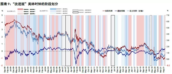 第二,单纯实际利率和通胀预期的上下组合还不能完全刻画所有状态,例如在实际利率和通胀预期一上一下的这两个组合中,名义利率究竟是上还是下也有差异,甚至我们还发通胀预期在历史上经常出现长期持平的象限,因此也都需要区分。因此我们还需要在原有的四象限基础上进一步细分来解决这一问题。
