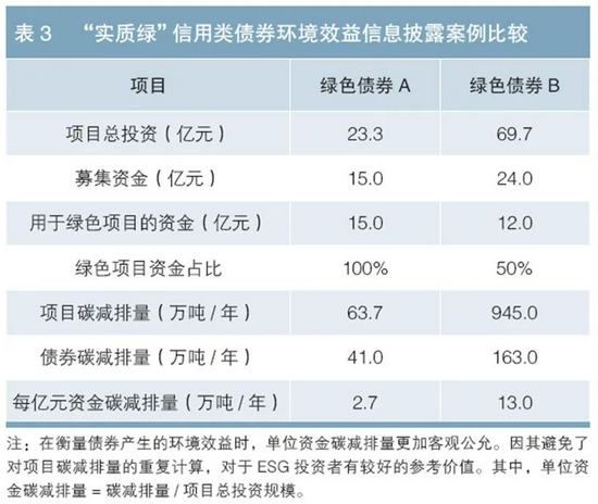 此外,通过测算“实质绿”公司信用类债券环境效益信息披露情况,笔者发现,绿色债券的环境效益衡量不能仅关注用于绿色项目的资金量,更应关注单位资金产生的环境效益。如表3所示,债券B虽然用于绿色项目的资金规模少于债券A,但是债券B的单位资金碳减排量和债券碳减排量均高于债券A。