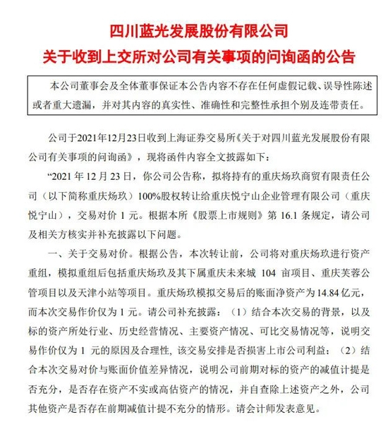 1月4日,蓝光发展在回复函中表示,公司本次交易的主要目的是为了解决困难项目的建设和交付问题。经评估,重庆炀玖商贸有限责任公司股东全部权益在评估基准日2021年8月31日的投资价值为228.46万元。本次交易以评估报告为基础,经协商各方达成一致重庆悦宁山收购公司所持重庆炀玖100%股权的对价为1元。