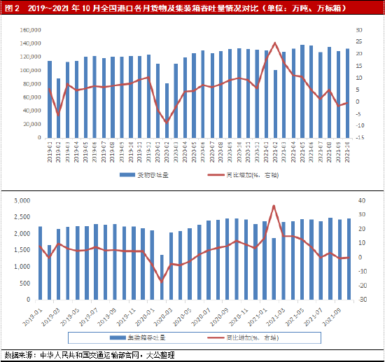 2021年1~10月,宁波舟山港和上海港仍分别居我国港口货物吞吐量和集装箱吞吐量首位;两港各月吞吐量变化及趋势类似,均反应出国内疫情初期受影响较为严重,后逐渐回升。