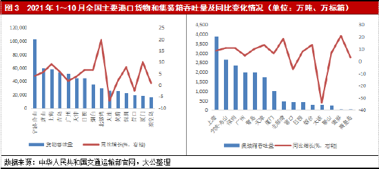 2021年上半年,受益于我国疫情防控形势平稳、全球经济逐渐复苏;宁波舟山港货物及集装箱吞吐量保持较大幅度增长,1~3月货物吞吐量同比增速较快,完成货物吞吐量2.93亿吨;4月起,货物吞吐量增速有所放缓,2021年7月起,受国际贸易形势以及零散疫情病例影响,宁波舟山港货物吞吐量有所波动。2021年1~10月,其累计实现吞吐量10.28亿吨,同比增长4.0%;累计实现集装箱吞吐量2,672万标箱,同比增加11.00%。