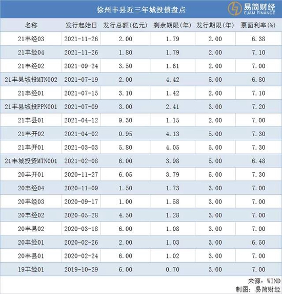 Wind数据显示,2019年至今,三年内丰县共发行了18支城投债券,总额70.5亿元,平均利率为6.97%。其中12支的发行者为丰县经济开发区投资发展有限责任公司,6支为丰县城市投资发展集团有限公司。