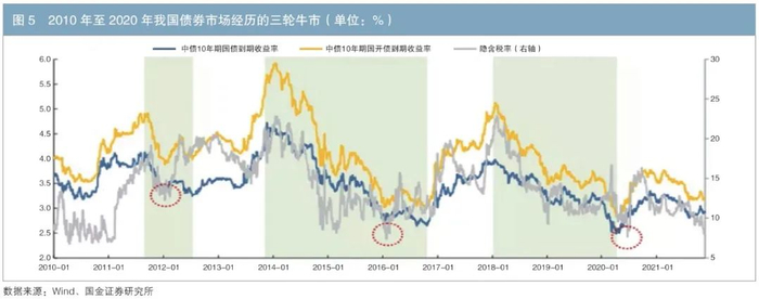 2010年至2020年间,若以10年期国债收益率下跌幅度90BP左右作为划分牛熊市的依据,我国债券市场共经历了三轮牛市,如图5所示。