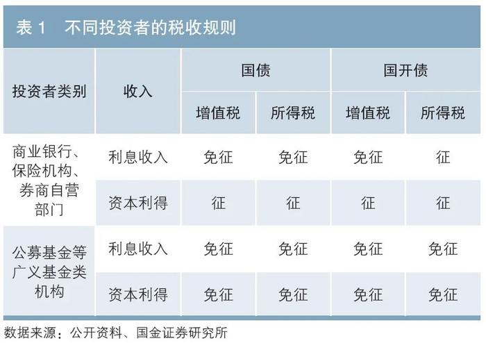 不同投资者投资不同券种面临的税收规则不同(见表1)。具体而言,对商业银行、保险机构和券商自营部门来说,国债利息收入免征所得税,政策性金融债不免,同时这些机构以配置为主,由于国债持有到期利息收入免税,配置国债相较于国开债成本更低;而对公募基金、资管等广义基金类机构来说,国债和政策性金融债利息收入和资本利得均免所得税,税收优惠方面没有区别,但政策性金融债尤其是国开债绝对收益更高,因此这类机构更偏好国开债。此外,不同机构考核制度及政策因素也会影响投资偏好,例如部分金融机构实施税前考核制度,因此在考虑投资标的时较少考虑税收因素。