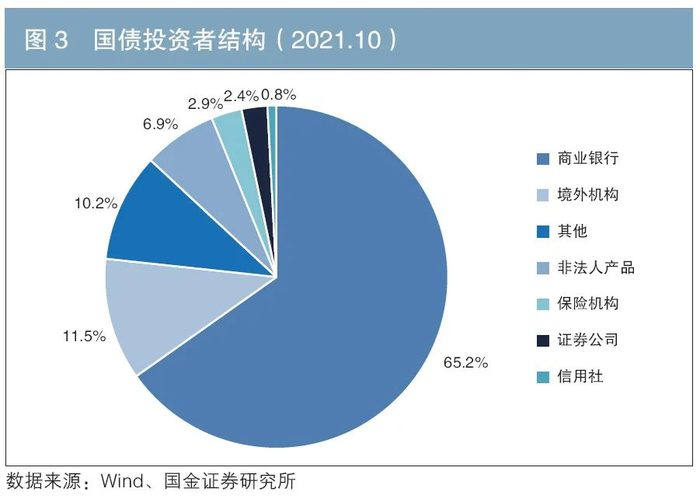 不同机构的偏好也是引起两类债券投资者结构差异的重要因素。如图3、图4所示,国债和政策性金融债的投资者均以商业银行为主,投资占比分别达65.2%和54.2%,但国债和政策性金融债投资者结构中非法人产品(包括证券投资基金、资产管理计划、银行理财产品、信托计划、保险产品等)投资比例差异较大,占比分别为6.9%和32.6%,即非法人产品相较于国债更多投资于政策性金融债,在政策性金融债的投资结构比例中仅次于商业银行。