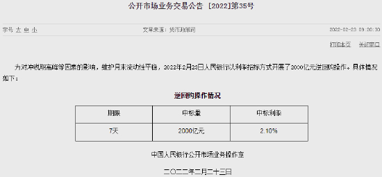2月23日,央行今日进行2000亿元7天期逆回购操作,中标利率为2.10%,与此前持平。因今日有100亿元7天期逆回购到期,实现净投放1900亿元。