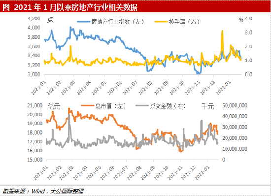 各指数环比均增长,房地产行业在2021年遇冷基本面下行后,2022年1月有所回暖。1月,房地产行业指数为3,460.69点,环比上行137.83点,同比下行290.30点。房地产行业交易换手率为1.42%,环比上升0.14个百分点,同比上升0.48个百分点。房地产行业总市值为18,475.91亿元,环比增长5.42%,同比下降4.62%。房地产行业成交金额为218.45亿元,环比增长15.25%,同比增长29.14%。同期,全国房地产贷款新增约6,000亿元,较去年四季度月均水平多增约3,000亿元。