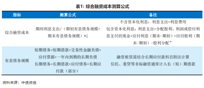 综合融资成本是企业债务融资的平均价格,体现了银行、非标和债券等债务融资渠道的平均成本。资金的定价机制为无风险利率+风险溢价+(流动性溢价,主要为债券融资),融资成本可以直接获得(评级报告、募集说明书)或者自行计算(见表1)。