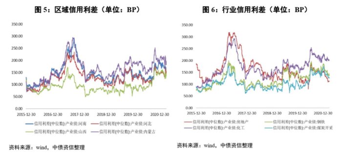 信用利差表示发债主体利率较无风险利率(国债收益率)的风险溢价水平。信用利差反映了资金提供方对发债主体信用风险的评价,作为融资成本反映出不同主体的融资环境差异。以永煤违约为例,市场风险偏好导致同行业(煤炭)信用债利差环比上日上升10.22个BP,利差走阔幅度高于其他周期性行业;此外,短期内对煤炭等行业风险偏好影响山西区域产业债利差环比上日上升11.04个BP。短期风险偏好影响企业的信用利差,信用利差的走势可以反映出企业融资的便利程度和成本高低。