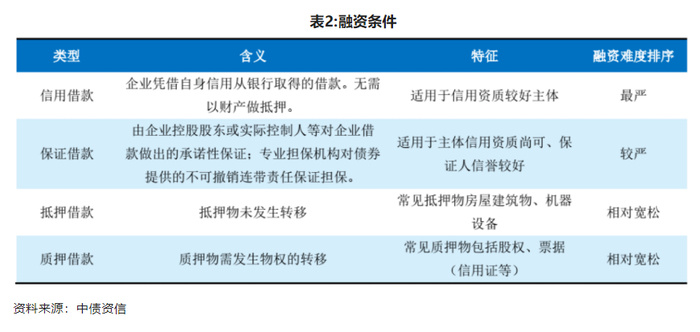 融资条件是指企业获得贷款所提供的增信措施,包括但不限于各类担保方式、票据融资及信用证所存入的保证金比例等。融资条件反映了企业为取得借款所必须付出的交换条件,是资金提供者对企业风险判断的间接表现。一般来说,信用借款为主的企业为信用资质好、融资环境优越的企业;反之,企业基本没有信用借款,反映出银行对企业信用评价很低,融资条件较为苛刻,该类企业融资环境相对更差。