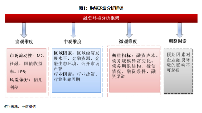 本文分析企业融资环境将从宏观层面、中观维度(区域、行业)和企业自身微观因素多方面深入分析。宏观融资环境是企业所处的外部大环境,包括市场流动性和风险偏好,体现了货币和信用两个维度,后文将阐述如何通过相关指标对货币和信用的宽紧程度有一定判断。中观层面需要分析区域、行业,这是企业自身经营所处的直接外部环境;宏观融资环境作用于不同行业、区域存在一定分化。受制于区域金融资源丰富程度和行业的政策导向等多种因素,部分夕阳产业、市场声誉差区域的企业融资环境也将受到制约。企业微观因素是融资环境最直接的反映,通过对企业融资成本、渠道和条件等多维度分析,可以得知企业自身依赖外源融资偿还债务的压力,对企业信用风险水平的分析至关重要。