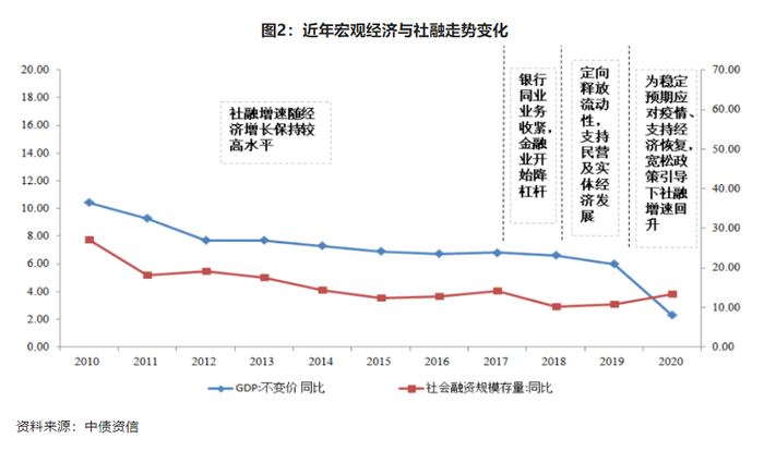 2019年,货币政策延续中央经济工作会议政策导向,为支持实体经济发展、缓解民企融资难的问题提供有效支持,央行采用降准、降息、增加逆回购等多重手段保持市场流动性。2020年,疫情冲击触发货币政策重心由“稳增长”向“防风险”转移。2020年M1、M2同比增速有所上升,保持市场流动性合理充裕。下半年M1同比增速连续数月连续上行,反映了企业融资环境的改善,同时反映实体经济修复边际动能增强。从社融数据看,年末社融存量规模同比增速达13.3%,处于近年较高水平,亦高于名义经济增速。2020年货币政策经历了稳定预期应对疫情、支持经济恢复、逐步回归常态、缓解银行负债成本和维稳信用市场以及调整宽松预期回归中性取向几个阶段。受益于2020年全年尤其上半年相对宽松的融资环境,全年新增债券违约主体数量同比下降;但受个别主体违约规模庞大等因素影响,违约规模明显增长。整体信用风险暴露略有下降。