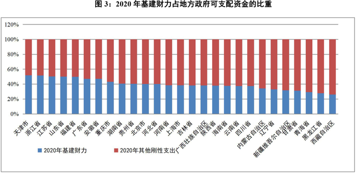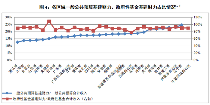 2、多数区域基建财力占地方政府可支配资金的比重约为35~50%,一般公共预算基建财力/一般公共预算合计收入一般为10%~25%,一般公共预算合计收入主要用于刚性支出;政府性基金基建财力/政府性基金合计收入一般为80~95%,政府性基金收入主要用于基建,上述比例在各年份之间相对稳定;