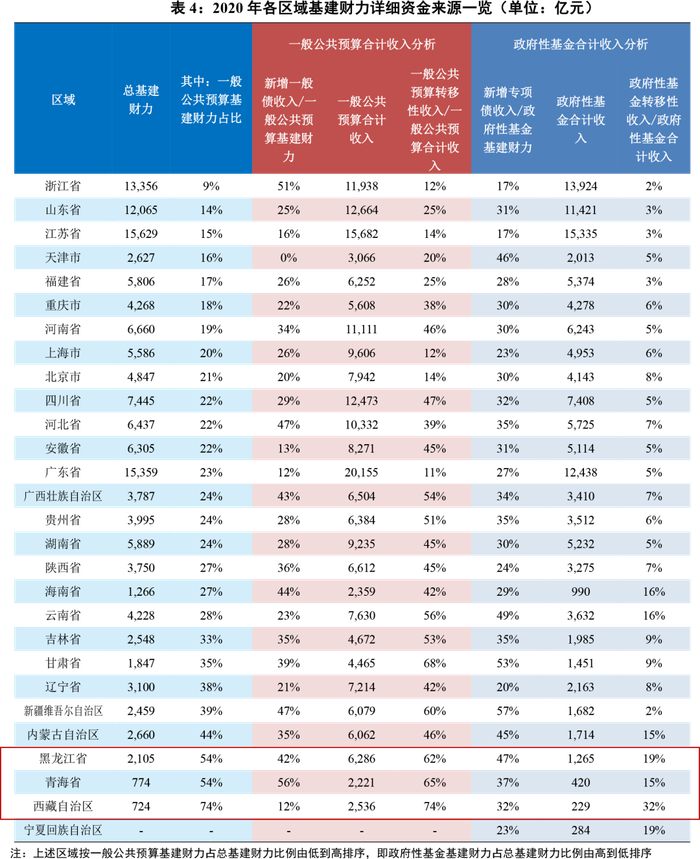 多数区域基建财力对政府性基金合计收入依赖较高;基建财力对一般公共预算合计收入依赖较高的区域,主要依靠其转移性收入和新增一般债收入等外源性收入。(1)政府性基金基建财力占基建财力比重较高,反应基建项目资金周转主要依靠国有土地出让收入和新增专项债收入为主的政府性基金合计收入。根据27省可得基建财力数据看,除内蒙古、辽宁、青海、黑龙江和西藏外,其余区域该比例均超过50%,政府性基金合计收入在全国多数区域基建项目资金周转方面占据相对重要地位,但不同区域对政府性基金合计收入的依赖程度呈现显著分化。该比例占比较高的区域以浙江、山东、江苏、天津、重庆、安徽、福建和北京等为代表(占比由高到低排序),上述区域总基建财力中政府性基金基建财力占比均超过75%,除天津外基本由于国有土地出让收入贡献较大所致,政府性基金合计收入在省内基建资金周转方面占据绝对主导地位,天津由于其较高的新增专项债发行规模,该比例五年平均亦高达81%(参见表4,2020年天津市新增专项债收入占当年政府性基金财力的比重接近一半)。(2)政府性基金基建财力占总基建财力比例相对较低的区域,以黑龙江、青海和西藏等为代表,集中在西部和东北地区,转移性收入或新增一般债收入等外源性收入对基建财力贡献显著。