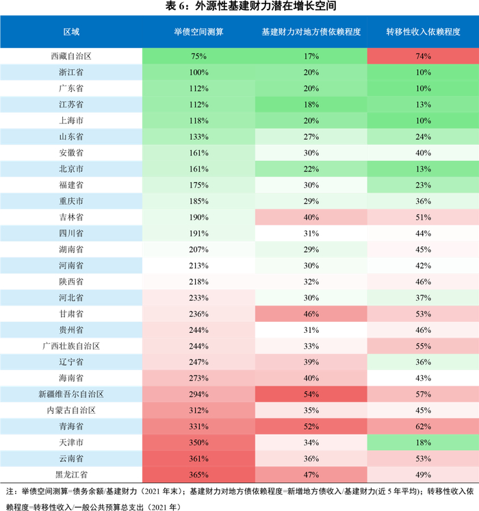 上表可以较为清晰地体现出区域外源性基建财力增长空间的分化,其中浙江、广东、江苏、上海、山东、北京六省依托内源性为主的基建财力结构,具有较大的地方债举债空间;安徽、福建、吉林、重庆、四川、湖南、河南、陕西、西藏、河北,上述区域地方债举债空间位于全国中等水平;辽宁、贵州、广西、甘肃四省基建财力对新增地方债收入或转移性收入依赖程度较高,同时举债空间接近下四分之一分位,潜在基建财力增长空间处于全国较靠后位置;黑龙江、云南、天津、青海、内蒙古、新疆和海南,该七省基建财力对新增地方债收入或转移性收入依赖较高,且举债空间排序位于全国各区域后四分之一。