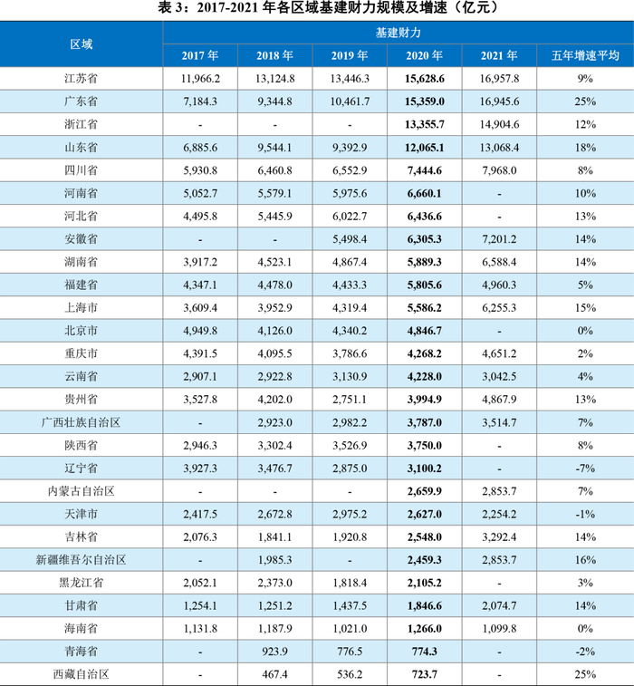 1、2017~2021年多数区域基建财力呈波动增长趋势,增速波动较大,其中2019年和2021年多数区域基建财力增速均有明显放缓,GDP大省基建财力规模最高,东北、西部地区和海南基建财力规模较小;