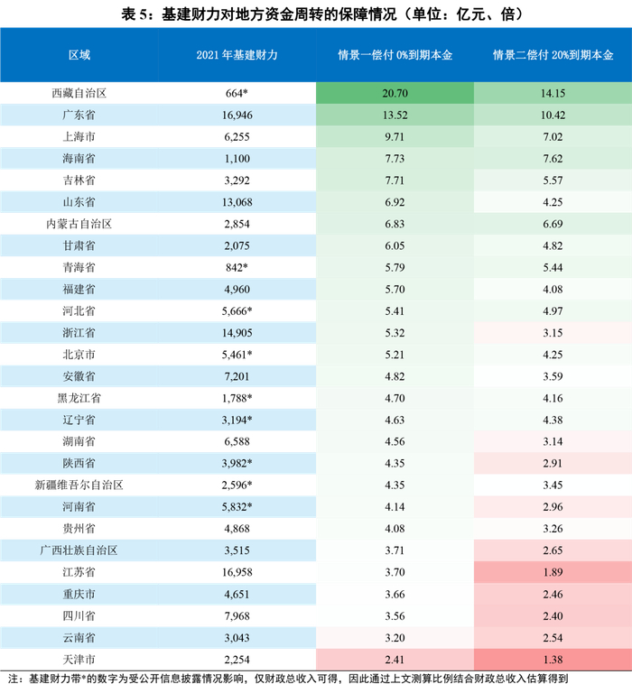 我们基于各区域2022年广口径资金周转量即地方债和城投还本付息需求,测算2021年基建财力对其保障情况[9]。其中地方债方面,按各区域历史再融资周转比例估算2022年再融资发行规模,将剔除当年再融资发行量后的到期本金和利息纳入支出需求口径;城投方面,在监管“保周转、控新增”融资政策背景下,按城投正常情景“偿付0%到期本金”和极端情景“偿付20%到期本金”假设资金周转需求。