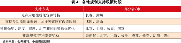 2)开展规划奖励方面,主要围绕容积率进行政策创新,如唐山、长沙、成都、沈阳等地提出允许容积率进行不同地块、不同城市更新单元之间进行平衡转移;云南省和长沙提出容积率指标补偿/奖励;长春提出建筑面积奖励;北京和沈阳则提出可适当增加建筑规模,不计入容积率核算。