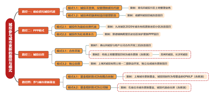 对大量城投的业务进行梳理甄别,归纳总结出城投参与城市更新的四大路径、对应模式以及风险点。