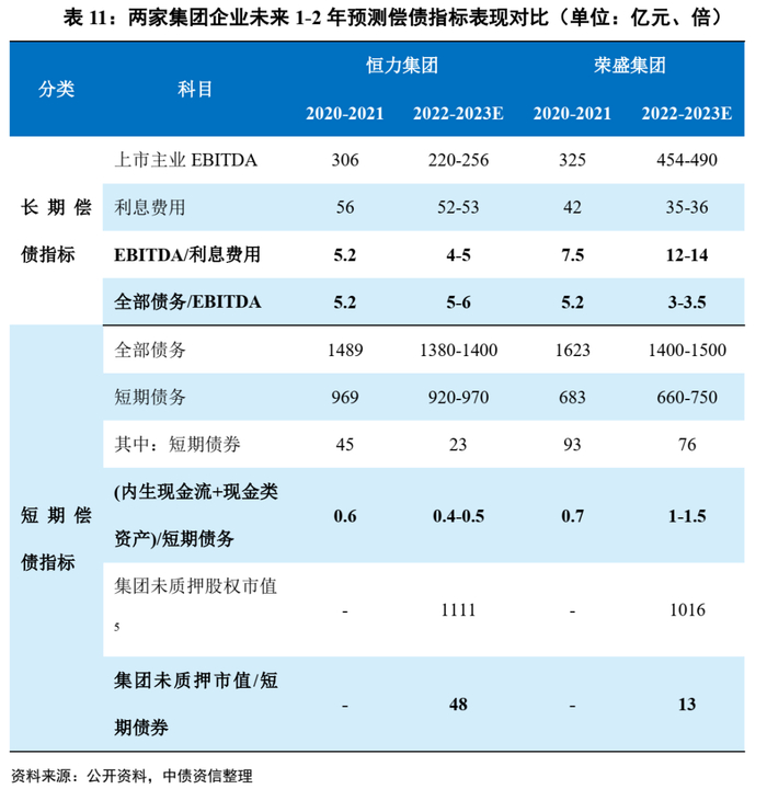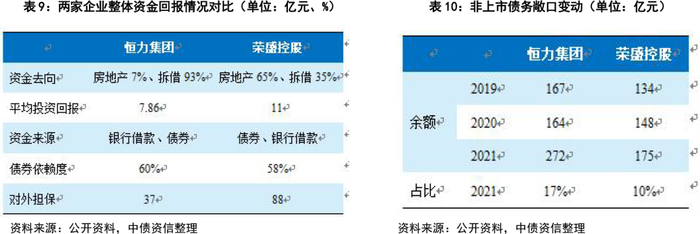 集团层面来看,恒力集团主要系对体外资金拆借,收取资金占用费,除上市公司分红外,每年计提的利息收入较高,关注实际回收情况;荣盛控股非主业投资则以房地产开发为主,投资回报主要依赖房地产去化获取的净现金流。综合考虑多元化业务和拆借款合并考虑其整体回报情况,恒力集团和荣盛控股,在上市公司良好业绩的支撑下,每年获得的分红以及利息收入能够覆盖自身利息成本,处在良性循环,具备长期经营基础。债务方面,恒力集团和荣盛控股非上市债务处于稳步增长阶段,虽然短债和债券占比(50%-60%)也不低,但非上市债务规模相比主业债务体量,以及上市公司盈利和市值规模来看可控,再融资腾挪空间相对更大。