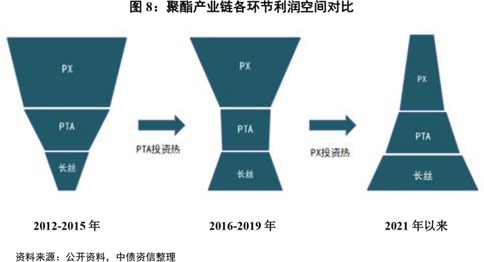 聚酯产业链包括“原油-石脑油-PX-PTA-聚酯”,上承原油,下至纺织服装、轮胎等终端消费行业。上游环节中,经过石油炼化生产出芳烃(PX等)或者烯烃(乙烯等),此前为炼化产业链。PX按照比例生产出PTA,PTA和乙二醇可生产出PET(聚酯)。