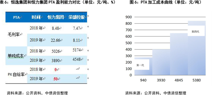 对比两家企业炼化设备,恒力集团和荣盛控股在炼化设备上复杂系数均较高,产品平均附加值较高;恒力集团第四条和第五条PTA产线采用第四代较为先进的设备,生产成本较低,位于成本曲线左端,与第一代产线相比,成本相差约500元/吨。产业链来看,对比PX-PTA产业链来看,2019年,恒力集团炼化项目投产,公司PX自给率由0%提高至50%,PTA单吨生产成本大幅下降,低于荣盛控股。