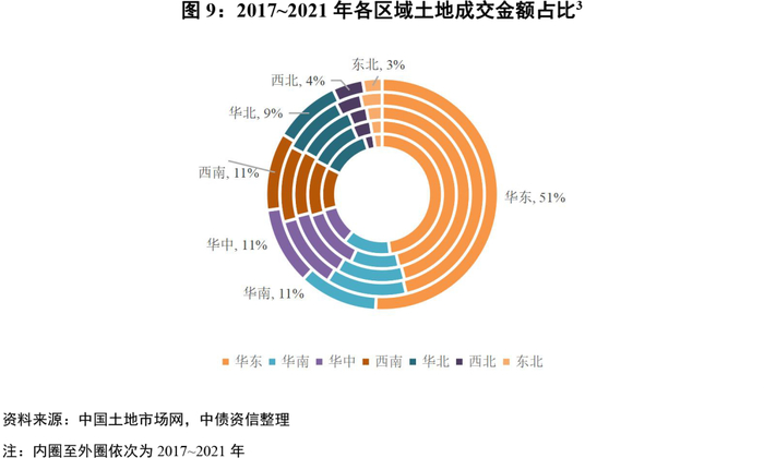 2017~2020年江苏省、浙江省、广东省、山东省、四川省、上海市六省土地成交金额约占全国50%,2021年合计占比55%;从区域来看,华东、华南区域土地成交额占比由2018年的57%升至2021年的62%,资金加速向华东、华南地区倾斜(犹以长三角、珠三角地区为主),聚集效应更加显著。
