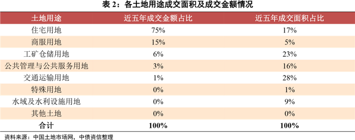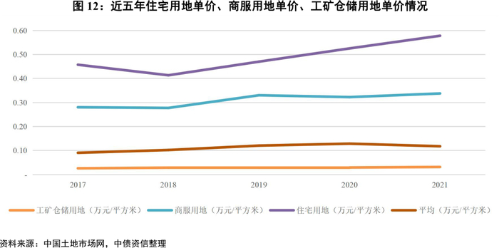从全国来看,近五年住宅用地成交面积占全国成交面积的17%、商服用地成交面积占全国成交面积的5%,但合计贡献了近90%的土地成交金额,且趋势稳定;工矿仓储用地成交面积占比23%,但受供地价格低廉影响土地成交额只占6%。单价方面,住宅用地和商服用地单价近五年波动增长,工矿仓储用地单价保持稳定,2021年住宅用地单价为0.58万元/平方米、商服用地单价为0.34万元/平方米,分别为当年工矿仓储用地单价的19倍和11倍。