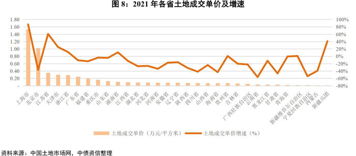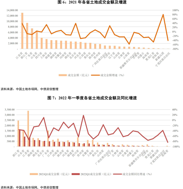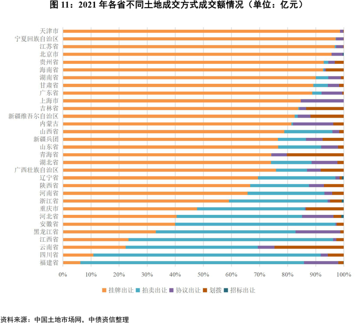 从各省来看,(1)受区域成交价格差异影响,不同省份供地方式结构差异较大:全国大多数省份土地成交以挂牌出让为主(2021年挂牌出让成交额占比均值超过70%),包括天津市、上海市等19个省份,而福建省、四川省、江西省以招标出让为主(2021年招标出让成交额占比均值超过73%),浙江省、安徽省等9个省份挂牌出让及招标出让均占一定比重。(2)云南省、青海省、重庆市、吉林省、新疆维吾尔自治区2021年划拨地成交额占全省成交额超12%(其中云南省划拨地成交额占比25%,青海省占比20%,为全国前两位),其余各省占比均在8%以下。考虑有偿划拨的合同款主要用于划拨土地自身的安置、拆迁,对区域项目建设、债务周转无实际推动作用,因此我们认为划拨地成交额占比越小,土地出让金的有效性越强,需关注剔除划拨地后的区域土地成交额稳定性及对区域债务的保障程度。