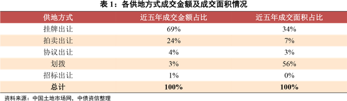 供地方式方面,全国土地成交主要以招标、拍卖、挂牌、协议、划拨出让为主。挂牌和拍卖是全国最主要的土地成交方式,近五年贡献了超过90%的土地成交额;划拨主要以无偿划拨为主,有偿划拨也仅需支付少量费用,因此虽然划拨地占全国土地成交面积为56%,但占土地成交金额仅为3%;不同区域供地方式差异较大,2021年部分区域划拨地成交额占比超12%,需关注剔除划拨地后的土地成交额稳定性。