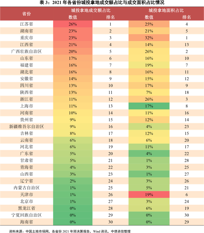 近年城投企业拿地成交额占比相对稳定,2021年城投企业拿地成交额有所增长,拿地单价首次超过非城投企业;2021年江苏省、湖南省、重庆市、江西省、广西壮族自治区城投拿地成交额占比超过20%