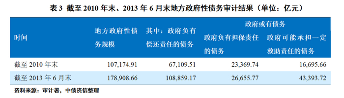 随着“加强地方政府性债务管理”[4]要求的提出,为摸清全国地方政府性债务规模、结构、类型、成因和管理情况,以及融资平台债务情况、运营状况及偿债风险,审计署分别在2011年和2013年展开了两次地方政府债务审计工作。其中,2011年发布的《地方政府性债务审计工作方案》将地方政府性债务分为三类:(1)地方政府负有偿还责任的债务,即政府债务;(2)地方政府负有担保责任的债务;(3)可能需要承担救助责任的其他相关债务。其中,(2)(3)更类似于“显性化”的政府隐性债务[5]。