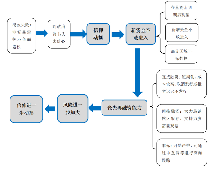隐性债务的最大风险在于其隐蔽性,此外,与地方政府债务相比,其还具有非统筹性和信仰动摇的风险。首先,地方政府债务是在中央统筹下形成的,有限额约束和续发等方面的规划,而隐性债务是自下而上形成的,规模、成本、再融资等并未经过统筹,易积少成多形成较大的风险。其次,地方政府债务可以视为“金边债券”,可以通过借新还旧实现周转,不易产生资金断裂,而隐性债务由于区域舆情、企业行业风险等可能会失去再融资能力,无法进行接续还款。