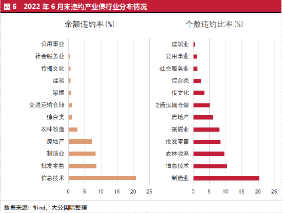 首先看一下存量违约债券情况。截至2022年6月末,产业债存量违约余额为5,040亿元,主要集中在制造业、房地产、批发零售、综合类企业、建筑、信息技术等行业领域。通过对我国债券市场历时8年的违约历史研究,大公从违约企业所在行业历史变迁的分析中可以得出,自2014年3月“11超日债”违约开始,产业债违约经历了从制造业到批发零售业,再到信息技术和交通运输仓储行业,最后到房地产和建筑业的变换过程,目前产业债违约风险已经大量出清,大概率不会出现某个行业违约事件集中爆发的情况。但随着供给侧结构性改革的深化和复杂国际环境的影响,未来债券市场违约事件将向发债规模较低的低信用级别企业转移。