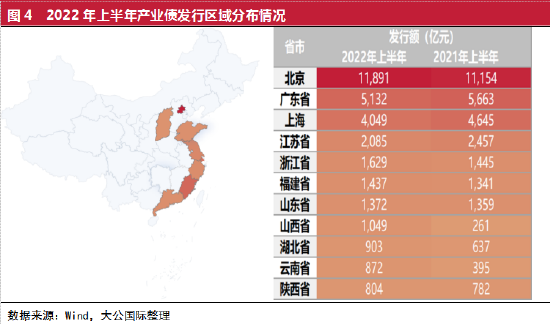 从区域分布方面来看,产业债发行规模处于前列的省市仍主要集中在经济发达省市。