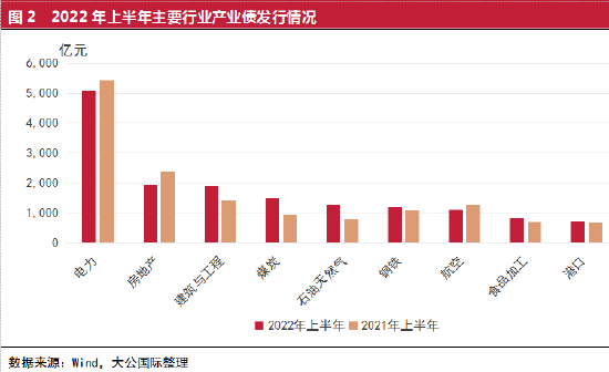 2022年上半年,产业债发行规模前10大行业依次为电力、房地产、建筑与工程、煤炭、综合石油天然气、钢铁、航空、食品加工、港口和基础化工。前10大行业产业债发行规模为16,145亿元,同比增加884亿元;占产业债发行规模的比例为43.92%,同比下降0.59个百分点,集中度有所下降。