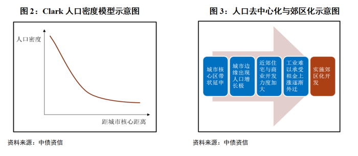 大多数城市市中心人口稠密,随着逐渐远离市中心,人口密度先而快速衰减,然后平缓递减。这也是常用人口密度模型“Clark模型”的重要假设。当区域人口基本符合Clark模型假设,意味着城市人口未出现去中心化现象,也未能形成新的人口增长极,此时盲目的郊区化、发展卫星城存在着较高的风险,即使通过强力政策干预也未必能够优化。部分区域政府为提高政绩,过早地通过区域内城投进行郊区化建设,其后果极有可能造成难以焦距人口和产业的局面,从而形成城市中的“无人区”。